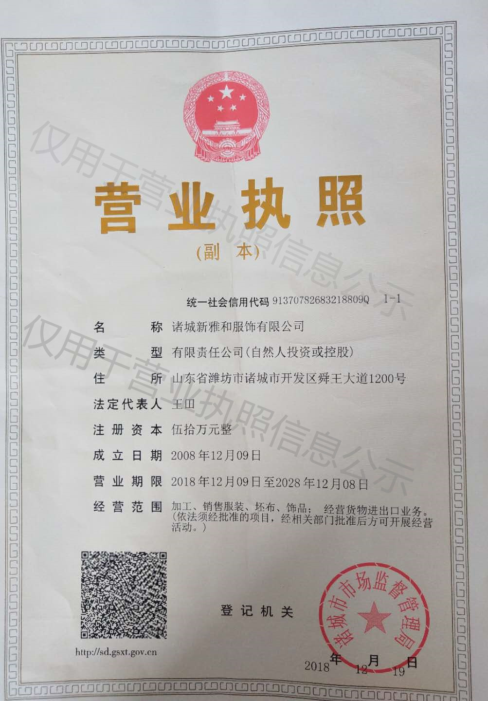 諸城新雅和服飾有限公司是一家擁有自營進出口權(quán)、集貿(mào)工一體的現(xiàn)代化針織服裝加工出口企業(yè)。公司座落在諸城開發(fā)區(qū)橫四路北206國道以東。公司現(xiàn)有現(xiàn)代化日本進口電腦縫制設(shè)備200多臺套,職工300人,年出口創(chuàng)匯1000萬美元。公司擁有一個團結(jié)務(wù)實、業(yè)務(wù)嫻熟、反應(yīng)迅速、年輕化、現(xiàn)代化的管理團隊。